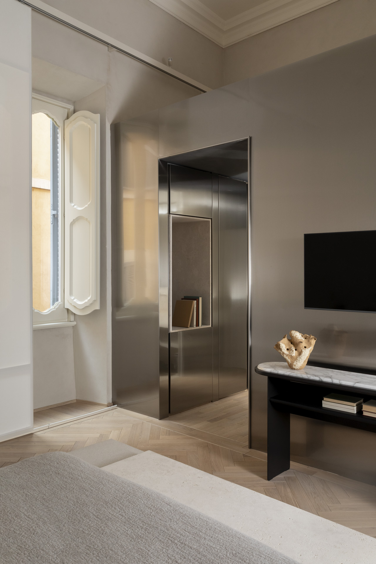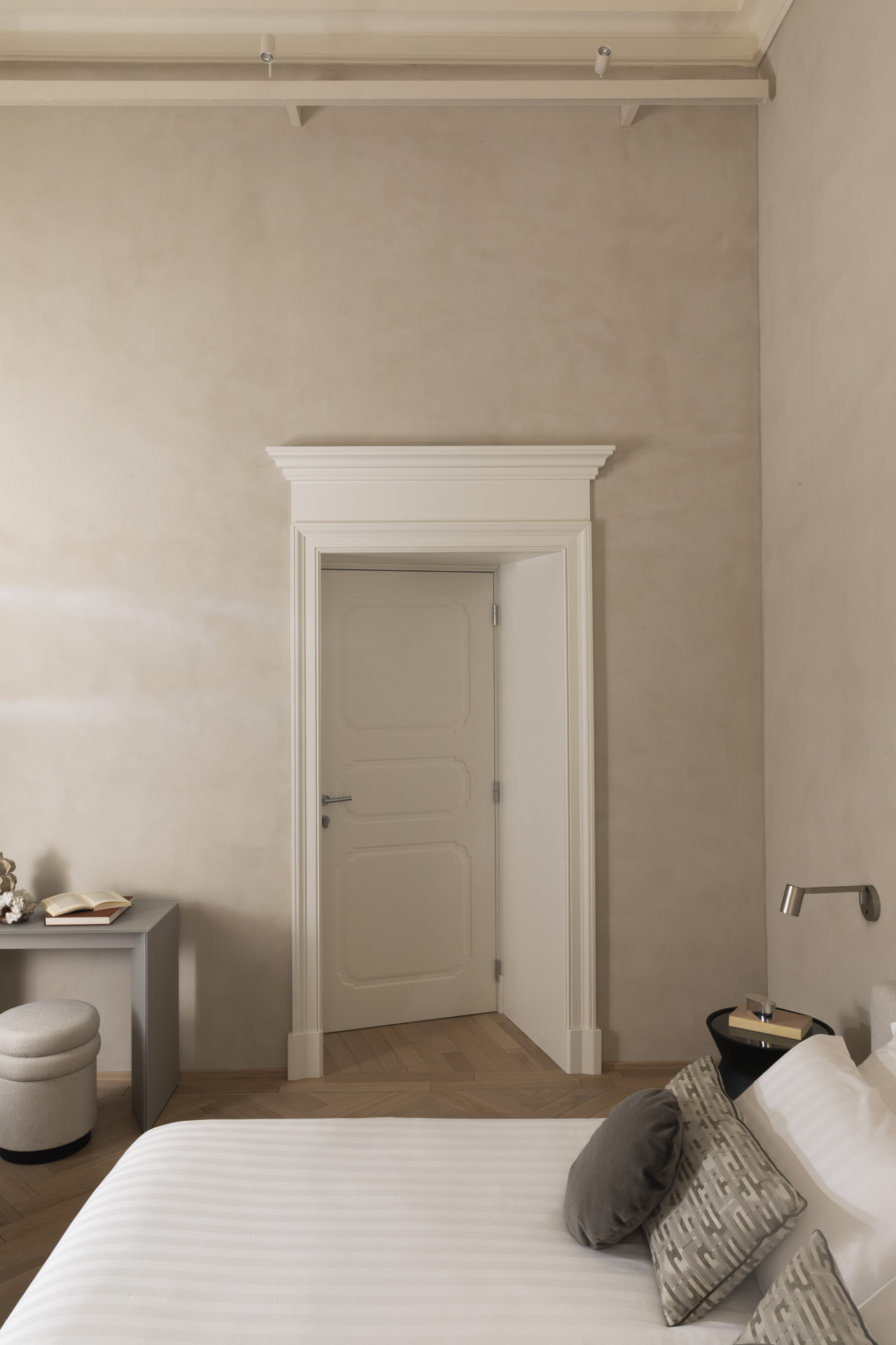 Gli intonaci in calce dalle cromie calde tipiche di Roma, il parquet di rovere a spina italiana e i bagni rivestiti in travertino romano creano un ambiente dove l'antico dialoga armoniosamente con arredi contemporanei. Una perfetta sintesi tra eredita storica e comfort moderno.